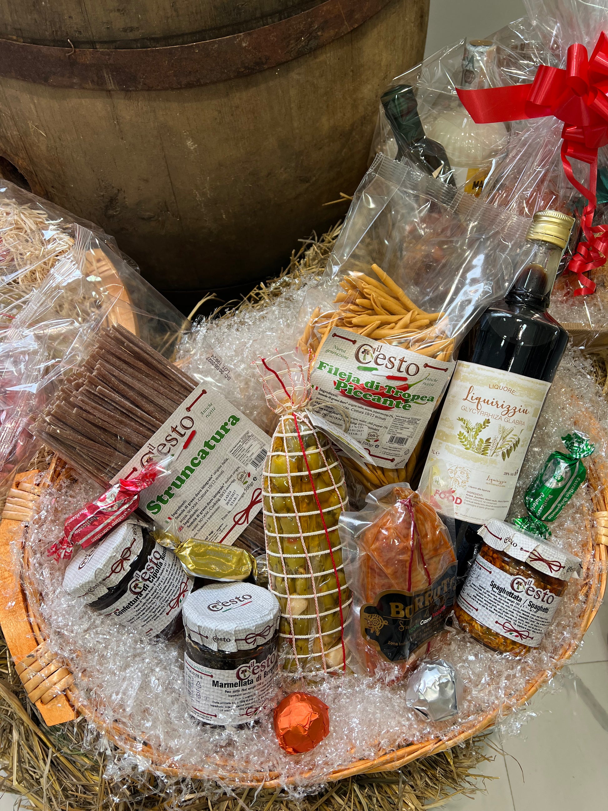 A completare questa selezione, il saporito Salame di Olive Verdi, un connubio di tradizione e creatività che porta in tavola un gusto unico, e la Spaghettata, un condimento versatile ideale per bruschette o primi piatti saporiti. Per concludere, un tocco di dolcezza e raffinatezza con il Liquore alla Liquirizia, autentica specialità calabrese. Un cesto che racconta l’essenza della Calabria, perfetto per chi desidera regalare un’esperienza di gusto e cultura unica.